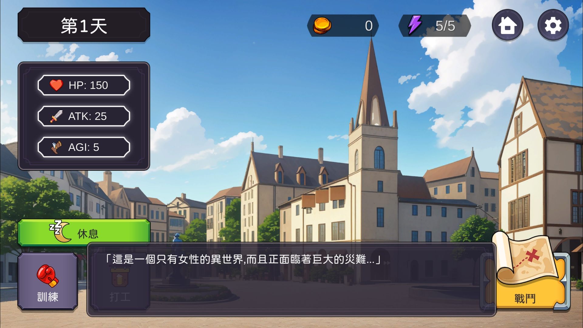使用金钱与行动点进行训练,提升你的能力值。强化你的 HP(血量)、ATK(攻击力)、DEX(敏捷度),打造专属的勇者!